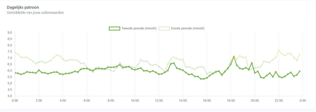 Dat advies volgde Ruud een week strak op. Hij stond na een paar dagen merkbaar fitter op en ervaarde meer energie. Je ziet ook – scroll nog maar even omhoog naar het plaatje van zijn bloedsuikerspiegel – dat de donkergroene lijn van week 2 veel rustiger is in de nacht. En vooral veel lager. Lees: geen spijsvertering, wel vetverbranding én herstelwerkzaamheden.